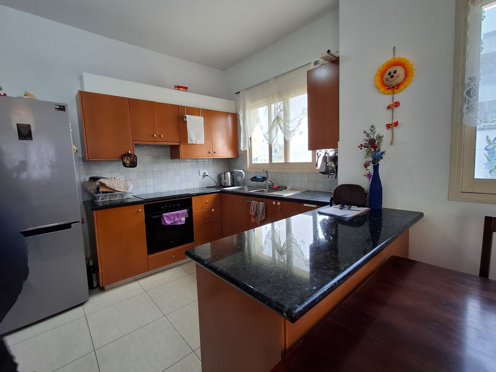 Υπάρχει ένας μεγάλος ενιαίος χώρος καθιστικού - τραπεζαρίας και κουζίνας, υπάρχουν παράθυρα και πόρτες που βλέπουν νότια και ανατολικά, επομένως ο χώρος είναι πολύ ευάερος και φωτεινός.